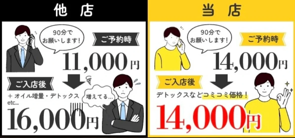 ・当店は日本人セラピストのみ在籍しております。・当店は、医療に類似する行為、風俗的サービスは一切行っておりません。・未成年者・同業関係者・暴力団関係者・刺青のある方・薬物使用者・泥酔者のご利用はお断りさせて頂きます。・入室後のセラピストの変更・キャンセルは出来かねます。・お客様のご都合で予約時間に遅れた場合、コースの変更は出来かねます。・施術前のシャワー、施術中の紙ショーツのご着用を必ずお願いいたします。・過度なサービスの強要、性的サービスの強要、自慰行為は禁止です。・セラピストへのタッチ、暴言や脅迫、その他セラピストが嫌がる行為は禁止です。・セラピストへのスカウト行為、勧誘など固くお断りさせて頂いております。・撮影または盗撮・盗聴などの行為は禁止です。・貴重品の管理はお客様でお願いいたします。紛失等に関しては責任を負いかねます。・掲示板等の内容をセラピストに共有する行為は禁止です。その他、当店がふさわしくないと判断した場合は即刻サービスを中止させていただきます。また内容によってはご利用を制限させていただく場合もございます。その際の返金も出来かねます。又禁止行為をされた場合、然るべき処置を取らせて頂きますので予めご了承ください。上記ご利用規約をご確認、同意の上ご利用いただきますようお願い申し上げます。特定商取引法に基づく表示■事業者名